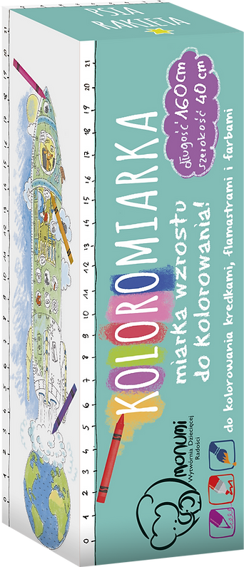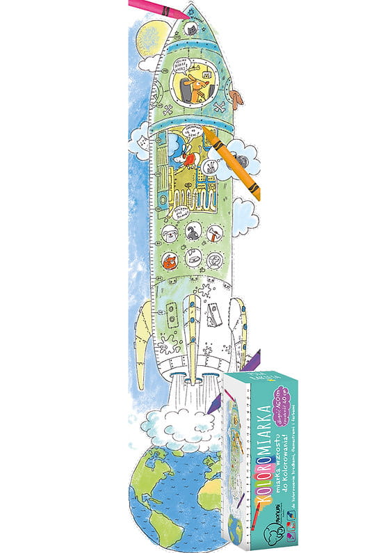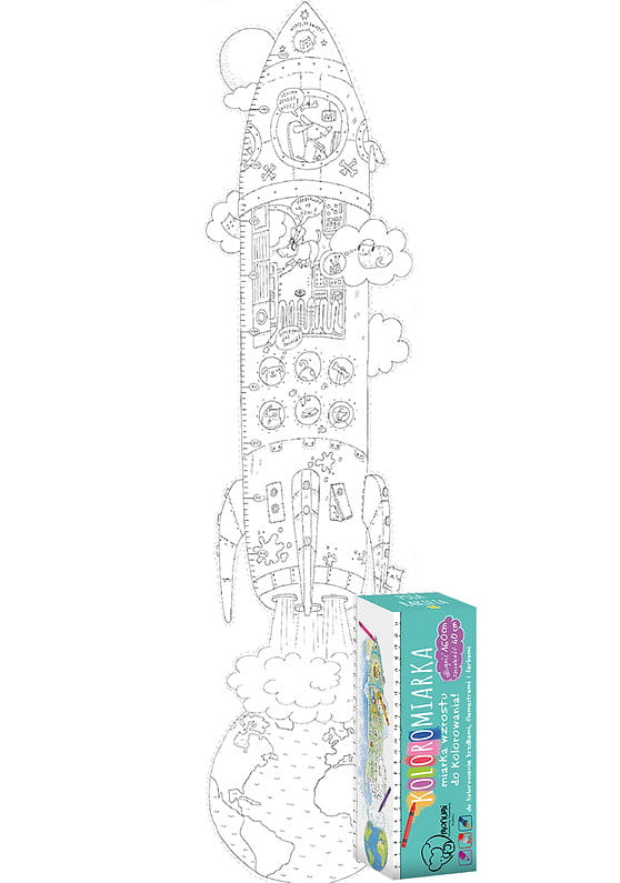 Podłużny plakat do kolorowania z miarką wzrostu. Do przyklejenia na ścianie. Wykonany z grubego, białego kartonu. Profesjonalna grafika, wyraźny druk w kolorze czarnym. Rolowany, nie składany – bez zagnieceń. W tekturowej tubie chroniącej przed zniszczeniem.Odpowiedni do kolorowania kredkami, flamastrami, markerami i farbami. Karton dobrze absorbuje wilgoć. Dzięki specjalnej warstwie spodniej nie fałduje się i nie przecieka.