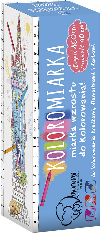 Podłużny plakat do kolorowania z miarką wzrostu. Do przyklejenia na ścianie. Wykonany z grubego, białego kartonu. Profesjonalna grafika, wyraźny druk w kolorze czarnym. Rolowany, nie składany – bez zagnieceń. W tekturowej tubie chroniącej przed zniszczeniem.Odpowiedni do kolorowania kredkami, flamastrami, markerami i farbami. Karton dobrze absorbuje wilgoć. Dzięki specjalnej warstwie spodniej nie fałduje się i nie przecieka.