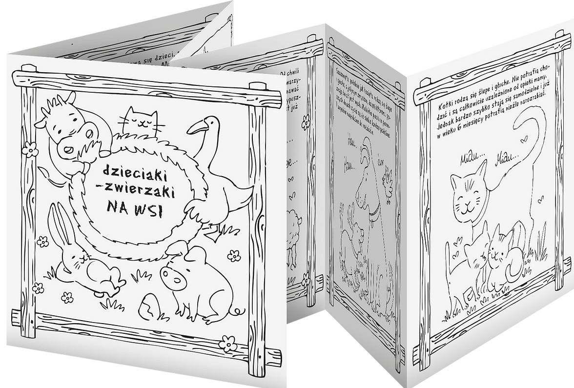 Sztywna książeczka do kolorowania w formie harmonijki. Wykonana z grubego, białego kartonu. Kolorowe etui chroniące zawartość. Wygodny format pozwala schować książeczkę do plecaka.