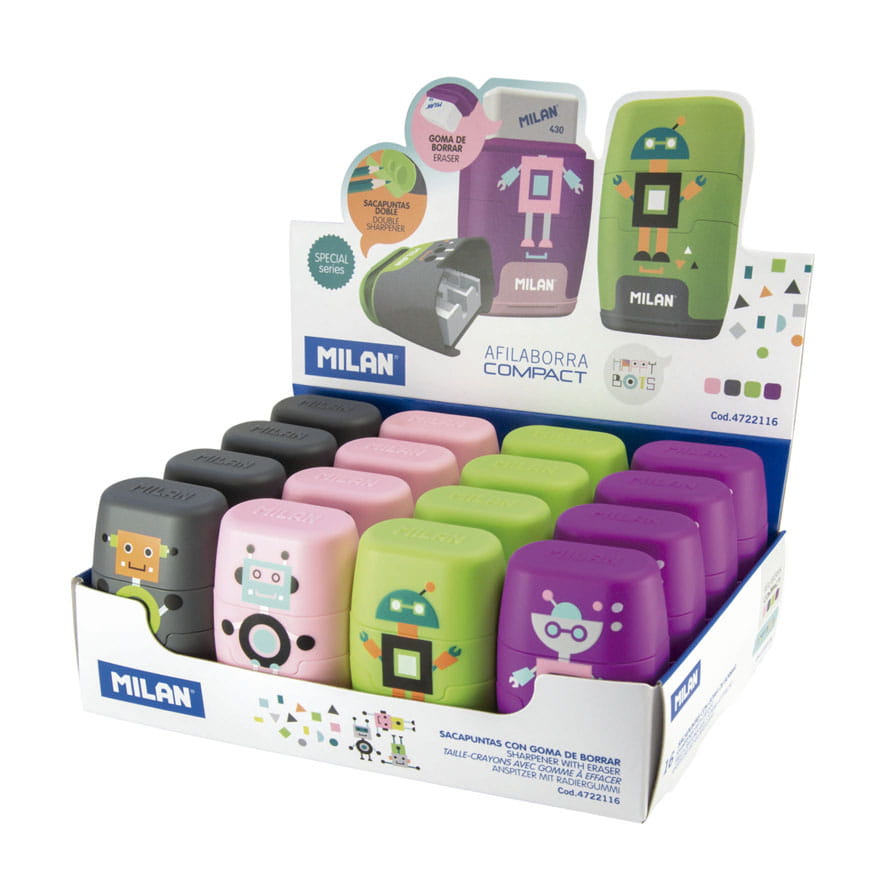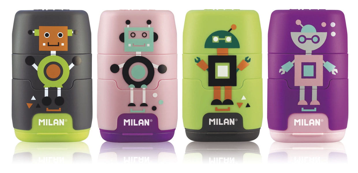 Fantazyjne połączenie gumki i temperówki w jednym. Z jednej strony podwójna temperówka na cienkie i grube kredki i ołówki. Z drugiej miękka gumka syntetyczna, a po środku pojemnik na ścinki. Wszystko w żywych kolorach i nowoczesnym designie nawiązującym do kolekcji HAPPY BOTS. Mają ostre i wytrzymałe ostrza ze stali węglowej dzięki czemu idealnie nadają się do wszystkich rodzajów ołówków. Posiadają system bezpiecznych ostrzy, który zapobiega odłączeniu się ostrza od korpusu temperówki. Idealne do użytku szkolnego. Dostępne w 4 kolorach z nadrukami: fioletowym, różowym, zielonym i szarym. Dostępne gumki zapasowe (model 430). Oryginalny produkt stworzony przez własny dział badawczo-rozwojowy MILAN. Rozmiar temperówko-gumki: 6,7 x 4 x 2,5 cm.