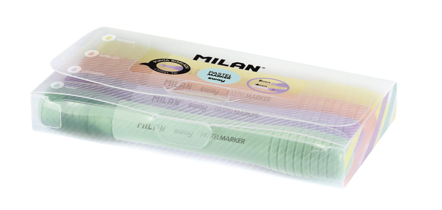 Zakreślacze fluorescencyjne w pastelowych kolorach ze ściętą końcówką. Grubość linii: 2 mm i 4 mm. W zestawie 4 kolory w przezroczystm etui: żółty waniliowy, miętowy, morelowy i lawendowy. Idealne do podkreślania i wyróżniania na papierze, kserokopiach lub papierze termicznym. Wysokiej jakości tusz na bazie wody jest zgodny z europejskimi i amerykańskimi normami bezpieczeństwa. Nie zawierają ftalanów, metali ciężkich i innych substancji toksycznych. Oryginalny produkt stworzony przez własny dział badawczo-rozwojowy MILAN. Rozmiar zakreślacza: 12,4 x 1,7 x 1,5 cm. Rozmiar etui: 12,5 x 7 x 1,7 cm.