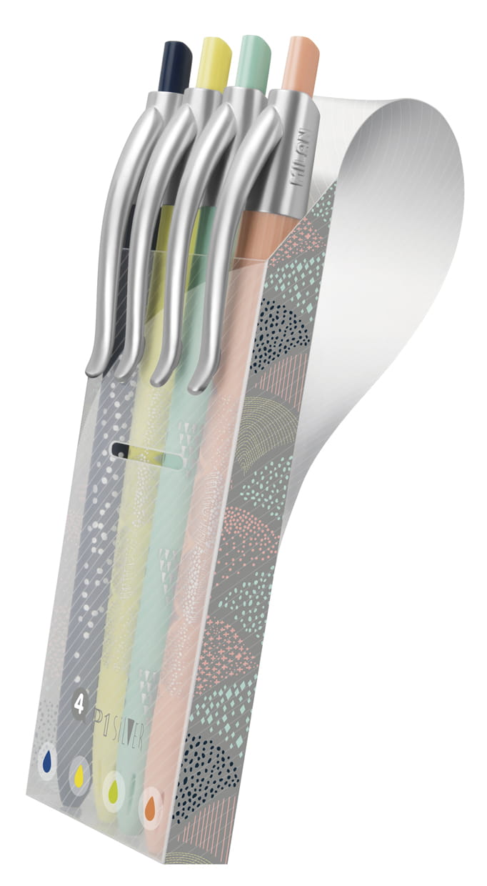 Długopisy P1 SILVER w elastycznym etui. Obudowa srebrna, przicisk i klips w tym samym kolorze co kolor tuszu: niebieskim, żółtym, różowym i zielonym. Pstrykane. Etui pozwala złożyć pokrywkę i ustawić długopisy w wygodnej pozycji biurkowej. Przybliżona długość pisania: 1200 metrów. Końcówka 1 mm. Atrament wyprodukowany w Niemczech. Oryginalny produkt stworzony przez własny dział badawczo-rozwojowy MILAN. Rozmiar długopisu: 14,1 x 1,7 Ø 1 cm. Rozmiar etui: 14,2 x 4,5 x 2,4 cm.