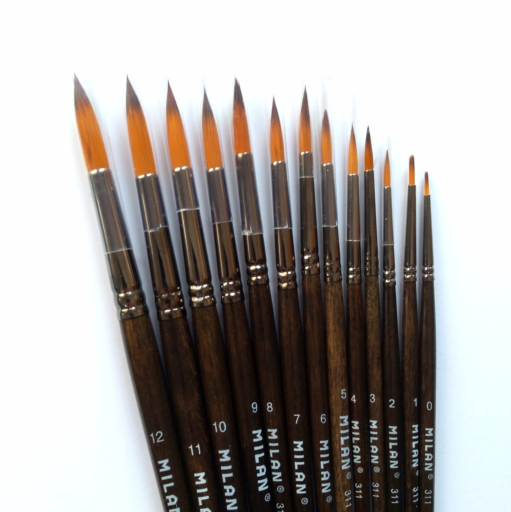 Okrągły pędzel syntetyczny serii 311 nr 2 z krótkim drewnianym trzonkiem polakierowanym na orzechowy kolor. Niklowana mosiężna skuwka, odporna na rdzewienie. Gładkie, miękkie i odporne włosie jest mieszanką poliestrowych włókien o średnicy 0,1 mm o złocisto-brązowym kolorze z ciemniejszą końcówką. Pędzel nadaje się do technik akwarelowych i wodnych zaś odporność włosia sprawia, że jest on zalecany również do technik akrylowych, olejnych i gwaszu. Polecane dla studentów i hobbystów. Średnica włosia: 2,6 mm. Długość włosia: 10 mm. Długość pędzla: 168 mm.
