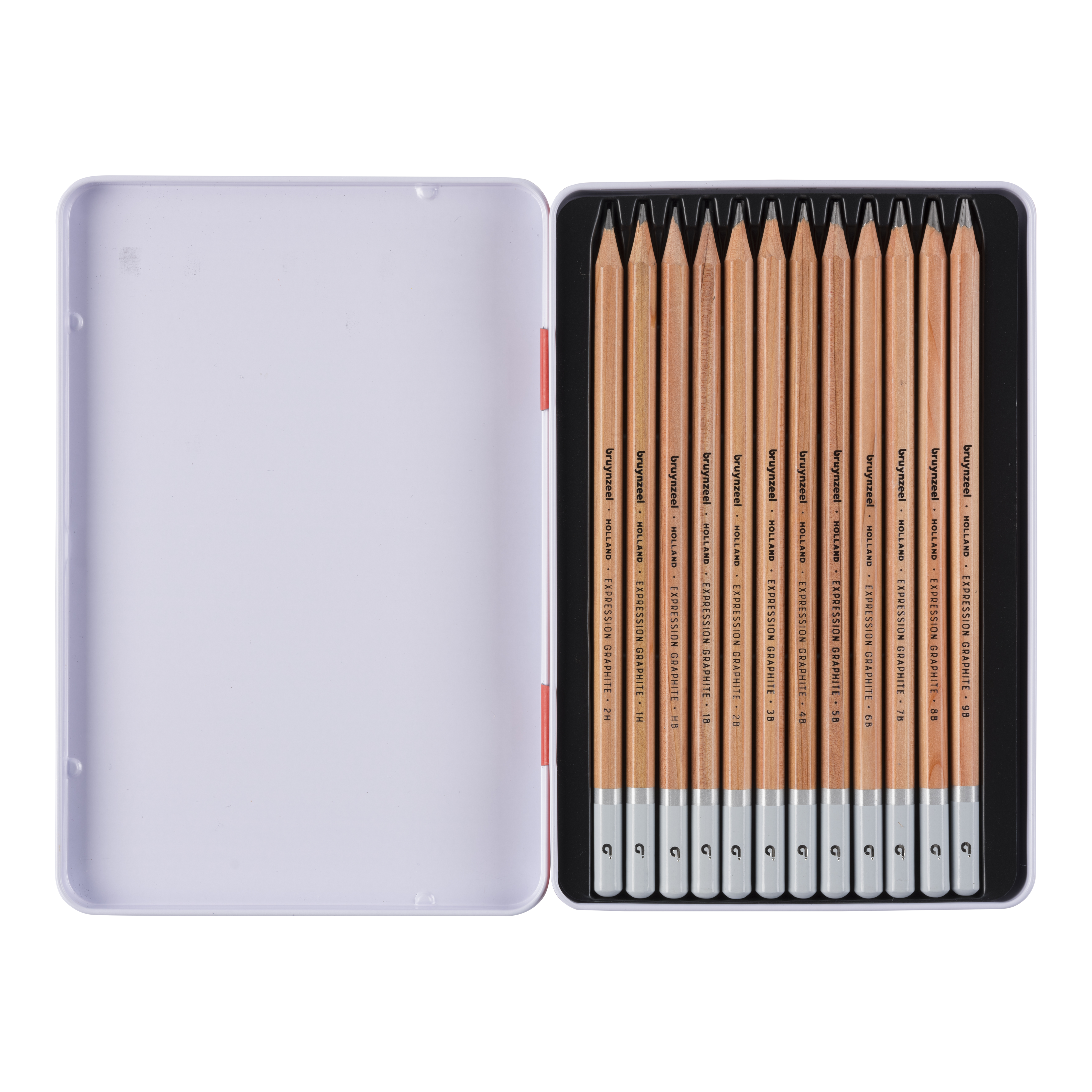 Wysokiej jakości ołówki artystyczne serii Expression. Zestaw zawiera 6 ołówków w drewnie o gradacji 2H, H, HB, B, 2B, 3B, 4B, 5B, 6B, 7B, 8B, 9B, które umieszczono w metalowym piórniku. Średnica rdzenia waha się między 2.2 mm a 3.5 mm - w zależności od miękkości. Kompaktowa forma pozwala wygodnie korzystać z zestawu w plenerze. Solidne metalowe opakowanie gwarantuje bezpieczne przechowywanie.