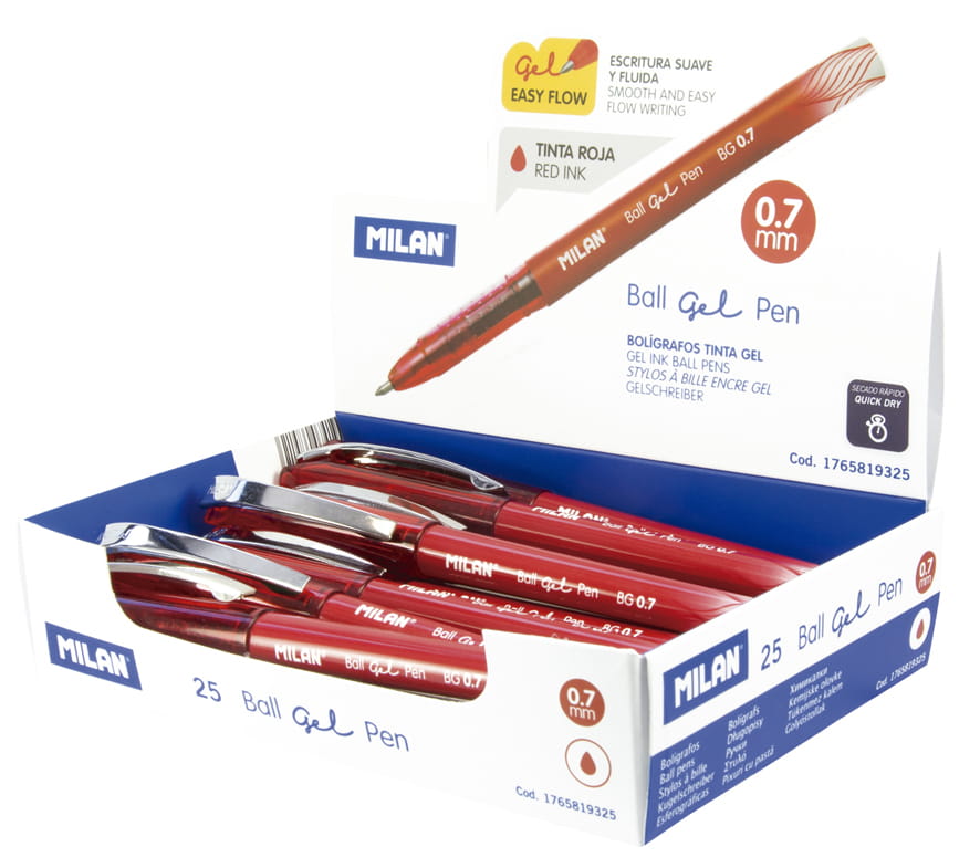 Czerwone długopisy żelowe. Tusz żelowy pisze płynnie i szybko schnie, nie rozmazuje. Obudowa tego samego koloru co tusz. Skuwka z metalowym klipsem w kolorze srebrnym. Przybliżona długość pisania: 950 metrów. Końcówka 0,7 mm. Atrament wyprodukowany w Niemczech. Rozmiar długopisu: 14,1 x 2,1 Ø 1 cm.