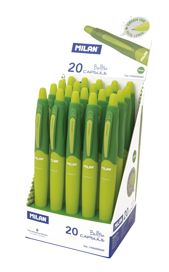 Zielone długopisy CAPSULE. Pstrykane. Przybliżona długość pisania: 1000 metrów. Końcówka 1 mm. Atrament wyprodukowany w Niemczech. Oryginalny produkt stworzony przez własny dział badawczo-rozwojowy MILAN. Rozmiar długopisu: 13,4 x 1,6 Ø 1 cm.