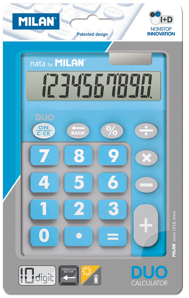 Kalkulator 10-pozycyjny z dużymi klawiszami i wyświetlaczem. Idealne dla osób starszych i słabowidzących. Wyrazisty zielony kolor podkreśla unikalny disign kalkulatora. Klawisz cofania. Podwójne zasilanie: bateria 1,5V oraz bateria słoneczna. Automatyczne wyłączanie. Kalkulatory MILAN spełniają wymagania dyrektywy RoHS o ograniczeniach stosowania niektórych substancji niebezpiecznych w urządzenia elektrycznych i elektronicznych. Oryginalny projekt stworzony przez własny dział badawczo-rozwojowy MILAN. Pakowany na blistrze. Rozmiar kalkulatora: 14,5 x 10,6 x 2,8 cm.