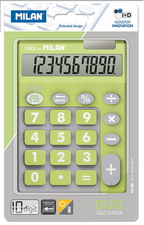 Kalkulator 10-pozycyjny z dużymi klawiszami i wyświetlaczem. Idealne dla osób starszych i słabowidzących. Wyrazisty niebieski kolor podkreśla unikalny disign kalkulatora. Klawisz cofania. Podwójne zasilanie: bateria 1,5V oraz bateria słoneczna. Automatyczne wyłączanie. Kalkulatory MILAN spełniają wymagania dyrektywy RoHS o ograniczeniach stosowania niektórych substancji niebezpiecznych w urządzenia elektrycznych i elektronicznych. Oryginalny projekt stworzony przez własny dział badawczo-rozwojowy MILAN. Pakowany na blistrze. Rozmiar kalkulatora: 14,5 x 10,6 x 2,8 cm.