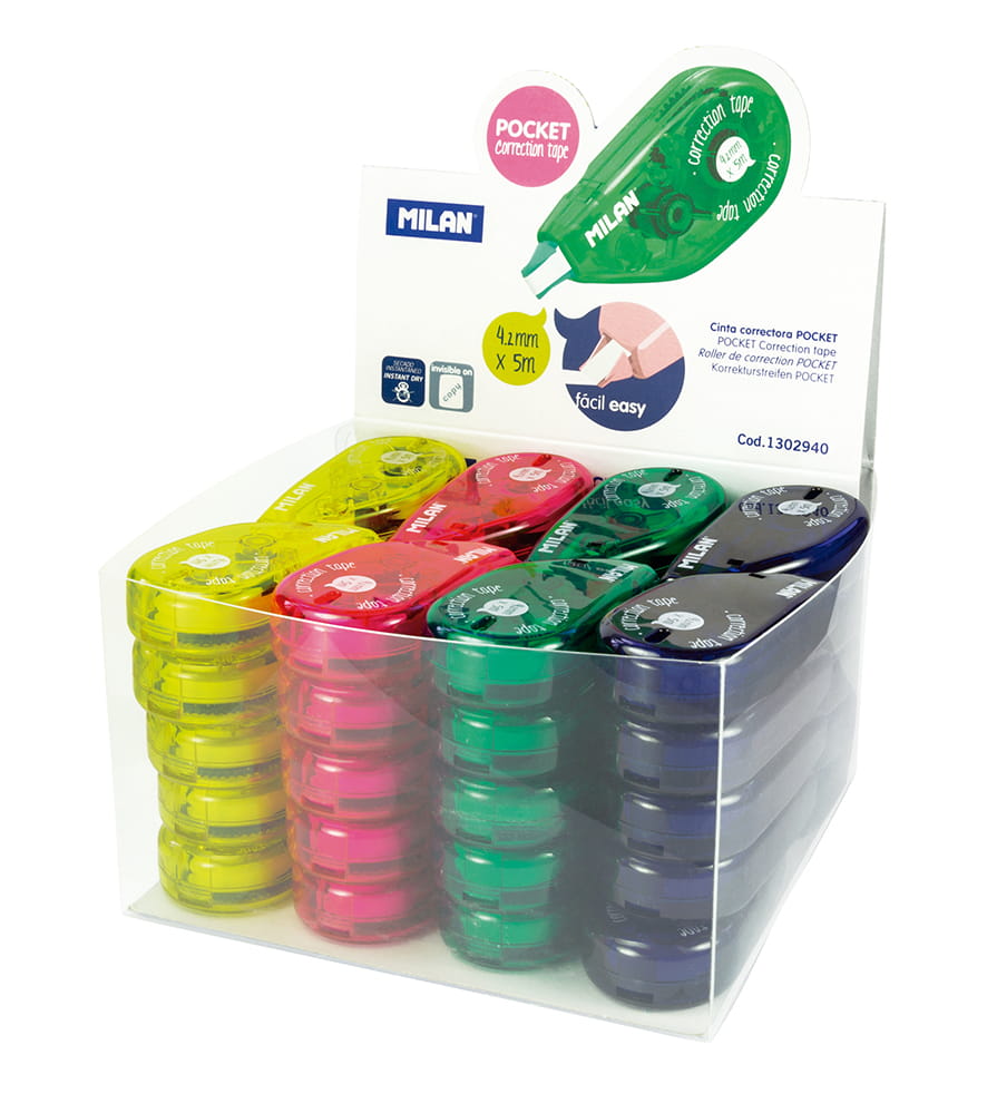 Korektory mini w taśmie. Rozmiar taśmy: szerokość 4,2 mm x długość 5 m. Szybki, czysty i dokładny. Korekty na wszystkich rodzajach papieru. Nie pozostawiają śladów na kserokopiach. Dostępne w 4 kolorach: żółtym, granatowym, różowym i zielonym. Rozmiar korektora: 6,3 x 3 x 1,4 cm.