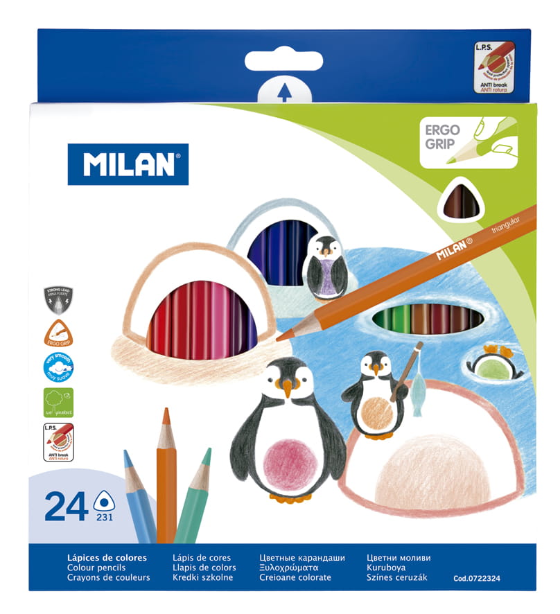 Kredki ołówkowe cienkie o średnicy grafitu 2,9 mm. Ergonomiczny trójkątny kształt. Posiadają unikalny system Lead Protection System (LPS), który zwiększa odporność grafitu na złamania poprzez przyklejenie go do drewna. Drewno jest wytrzymałe i miękkie umożliwiając łatwe temperowanie. Wysokiej jakości pigmenty w żywych, intensywnych kolorach są odporne na działanie światła. Kreska wykonana kredką MILAN jest miękka, jednolita o wyraźnym odcieniu. Nie tworzy rowków ani nie niszczy papieru. Drewno pochodzi ze zrównoważonych plantacji. Każda kredka ma nadrukowaną nazwę koloru po angielsku. Kredki MILAN są zgodne z europejskimi i amerykańskimi normami bezpieczeństwa. Nie zawierają ftalanów, metali ciężkich i innych substancji toksycznych. Są bezpieczne dla dzieci. Rozmiar kredki: 17,4 x Ø 0,64 cm. Rozmiar opakowania: 21 x 19 x 1 cm.