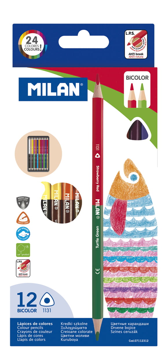 Kredki ołówkowe cienkie, dwustronne 12 sztuk = 24 kolory. Średnica grafitu 2,9 mm. Ergonomiczny trójkątny kształt. Posiadają unikalny system Lead Protection System (LPS), który zwiększa odporność grafitu na złamania poprzez przyklejenie go do drewna. Drewno jest wytrzymałe i miękkie umożliwiając łatwe temperowanie. Wysokiej jakości pigmenty w żywych, intensywnych kolorach są odporne na działanie światła. Kreska wykonana kredką MILAN jest miękka, jednolita o wyraźnym odcieniu. Nie tworzy rowków ani nie niszczy papieru. Drewno pochodzi ze zrównoważonych plantacji. Każda kredka ma nadrukowaną nazwę koloru po angielsku. Kredki MILAN są zgodne z europejskimi i amerykańskimi normami bezpieczeństwa. Nie zawierają ftalanów, metali ciężkich i innych substancji toksycznych. Są bezpieczne dla dzieci. Rozmiar kredki: 17,5 x Ø 0,64 cm. Rozmiar opakowania: 21,8 x 10 x 1 cm.