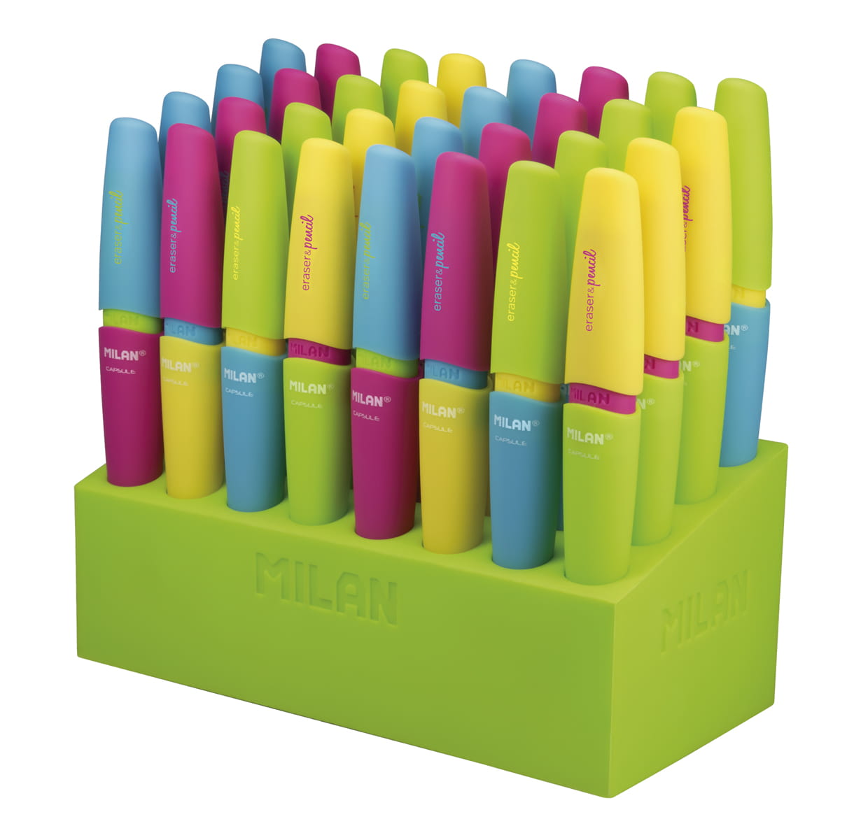 Ołówki automatyczne z grafitem 2B 0,7 mm. Grafit 2B jest miękki dzięki czemu idealnie nadaje się do pisania i rysowania artystycznego. Na końcu pod obudową duża gumka do wymazywania. Ołówek o pogrubionym kształcie, ułatwiający uchwyt, szczególnie polecany młodszym dzieciom. Dostępne w 4 kolorach: żółtym, niebieskim, różowym, jasnozielonym. Oryginalny produkt stworzony przez własny dział badawczo-rozwojowy MILAN. Wymiary ołówka: 13 x 1,8 x 1,6 cm. Dostępne zapasowe gumki i grafity.