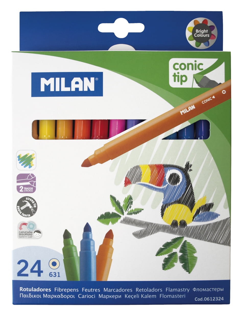 Flamastry z wytrzymałą i elastyczną stożkową końcówką o średnicy 5 mm, która nie wpada do środka nawet przy silnym nacisku. Po chwilowym odkształceniu końcówka zawsze wraca do pierwotnego kształtu. Pozwala na rysowanie cienkich i grubych linii od 0,75 mm do 3 mm. Tusz na bazie wody tworzy jaskrawe i intensywne kolory, które można ze sobą mieszać. Tusz można łatwo wyprać z większości tkanin (moczyć tkaninę w zimnej wodzie przez godzinę, a następnie prać w pralce w niskiej temperaturze). Bezpieczna wentylowana skuwka umożliwia oddychanie w przypadku połknięcia. Flamastry MILAN są zgodne z europejskimi i amerykańskimi normami bezpieczeństwa. Nie zawierają ftalanów, metali ciężkich i innych substancji toksycznych. Są bezpieczne dla dzieci. Rozmiar flamastra: 16,5 x Ø 1,04 cm. Rozmiar opakowania: 20,2 x 14,6 x 2,4 cm.