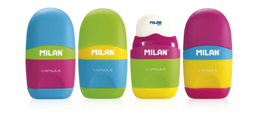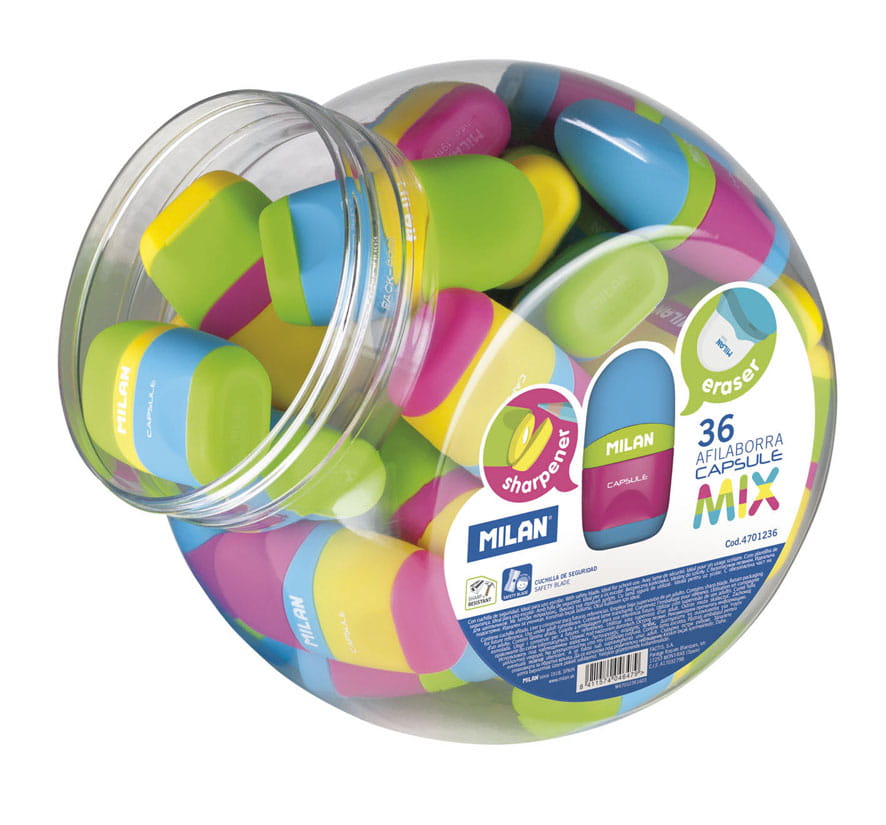 Fantazyjne połączenie temperówki i gumki w jednym. Z jednej strony pojedyncza temperówka na cienkie kredki i ołówki. Z drugiej miękka gumka z syntetycznego kauczuku, a po środku pojemnik na ścinki. CAPSULA MIX daje możliwość kreowania własnego wzoru kolorystycznego dzięki możliwości kompletowania i wymiany poszczególnych części w różnych kolorach. Mają ostre i wytrzymałe ostrza ze stali węglowej dzięki czemu idealnie nadają się do wszystkich rodzajów ołówków. Posiadają system bezpiecznych ostrzy, który zapobiega odłączeniu się ostrza od korpusu temperówki. Idealne do użytku szkolnego. Oryginalny produkt stworzony przez własny dział badawczo-rozwojowy MILAN. Rozmiar temperówko-gumki: 6,5 x 3,5 x 2,4 cm.